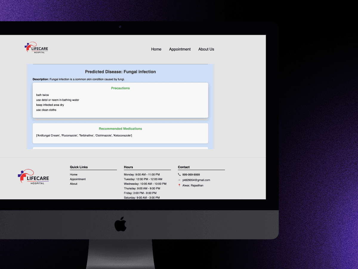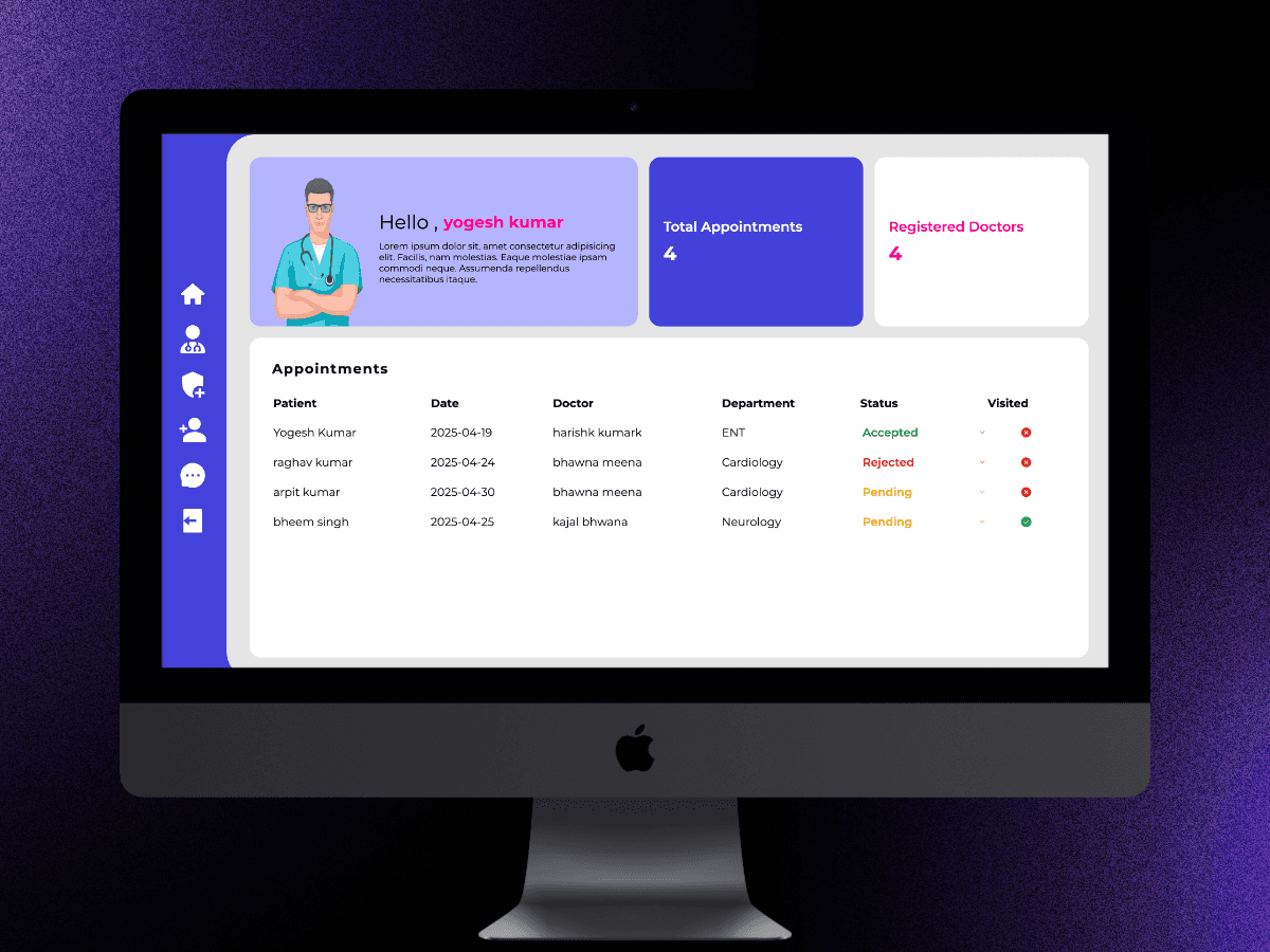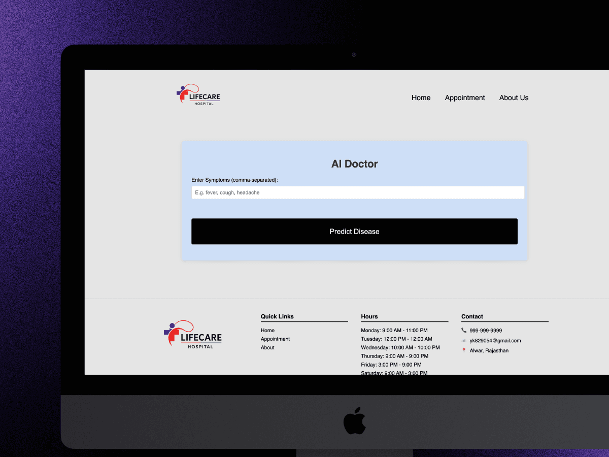 A web-based Hospital Management System with integrated disease detection and appointment booking. Patients can input symptoms for possible diagnosis and easily schedule appointments, while doctors and admins manage operations through a streamlined interface.